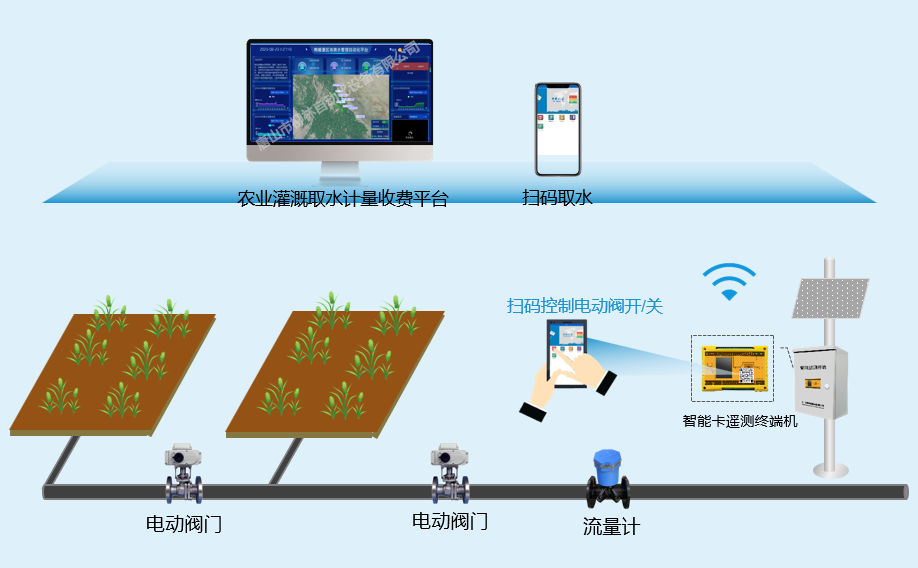 农业取水计量监测控制系统主要通过智能卡遥测终端机对灌溉现场安装的水泵、电动闸门或电动阀门进行远程控制,实时监测取水流量,并配套灌溉取水计量收费平台,实现远程监控、充值缴费、阶梯水价、水权分配、用水分析等功能。