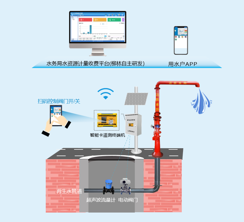 再生水取水计量监测系统主要对园林绿化、道路喷洒、环卫、生态景观等使用再生水,对取用水进行计量收费管理,通过安装智能卡遥测终端机,可实现扫码控制阀门/泵开关、水量计量、在线充值缴费等,监控中心完成水费计收。该系统的使用对缓解水资源短缺状况、提高水资源利用效率、促进水资源节约保护具有重要意义。