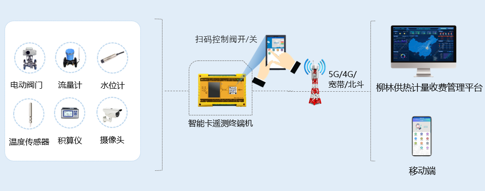 热网计量监测系统对热量、水位、温度、压力等数据进行实时监测、扫码控制阀门开/关,智能卡遥测终端并通过有线/无线通信方式,将数据上传至供热计量收费管理平台,实现收费管理、远程/在线缴费、报表管理等功能。