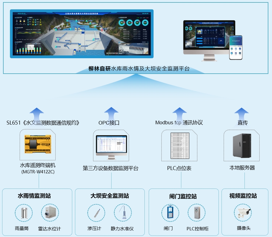 柳林水库雨水情测报及大坝安全监测平台,实现了与下游软硬件测无缝对接,展现了接口对接、通信协议、数据直传等多种对接方式,实现了多端数据交互、互通。