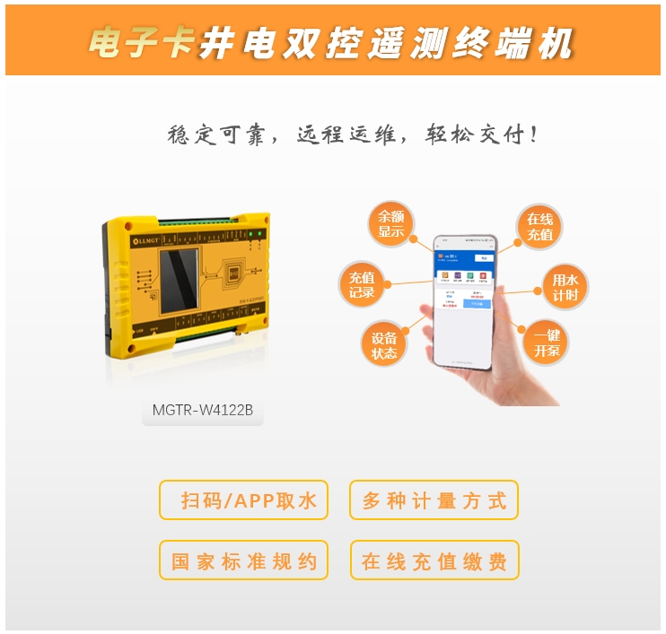 唐山柳林智能卡井电双控遥测终端机(MGTR-W4122B)是针对取水计量控制系统开发智能终端产品。集预收费、流量监测、电量监测、余额提醒、欠费停机、无线传输、远程控制等多种功能于一体,并可根据项目需求选择实体IC卡、APP电子卡、及扫码取水两种方式。其设计理念为稳定可靠,远程运维,轻松交付,现已被广泛应用于河南,河北,内蒙,黑龙江,吉林,新疆等各个省市地区。