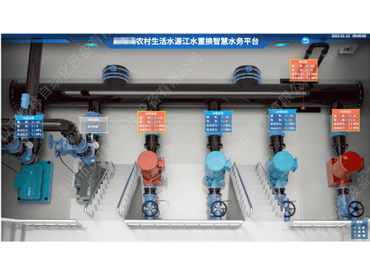 其次,孪生系统基于整个农村供水场景的数字化以及三维化设计并实现了科学、合理、易用的用户UI系统。用户通过UI系统实际使用数字孪生系统,该系统的初始界面为整个农村水厂供水的整体实时数据、预警信息以及视频监控等信息在三维场景下的展示。用户通过预警信息可以轻松掌握关键设备运行异常问题、消毒不及时问题、末端水质不达标问题以及供水效率问题。从而真正做到高效科学供水,有效避免不必要的人员财产损失。用户可以通过用户UI系统两侧控制开关收放上层信息展示。以便于更容易更清晰地查看整个农村水厂供水的三维场景。